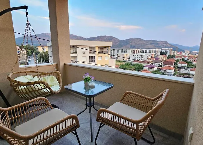 这间50平方米的公寓距离莫斯塔尔国际机场有95公里. 在露台上,旅客可以看到城市景致.